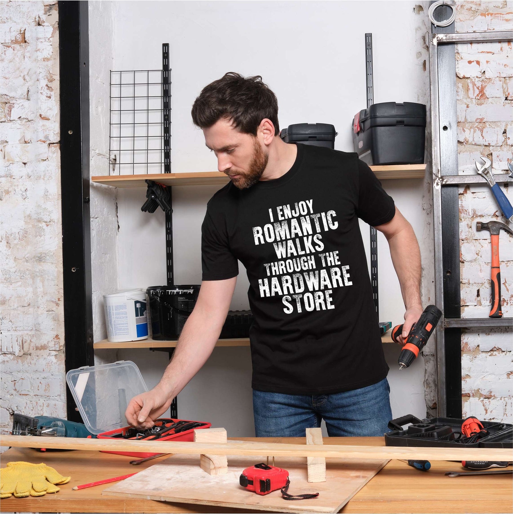 Men's Funny garage hardware store T-shirt I enjoy romantic walks papa dad tshirt
